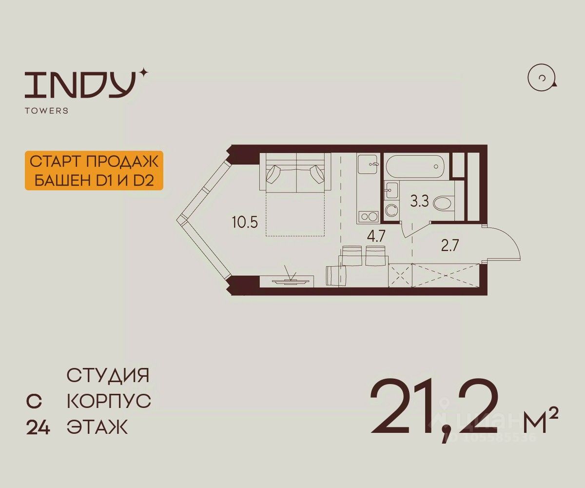 Продается просторная студия на 24 этаже жилого комплекса Indy Towers. Вид из окон: во двор. Срок сдачи: 4 кв. 2026 г.