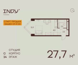 Продается просторная студия на 24 этаже жилого комплекса Indy Towers. Вид из окон: во двор. Срок сдачи: 4 кв. 2026 г.