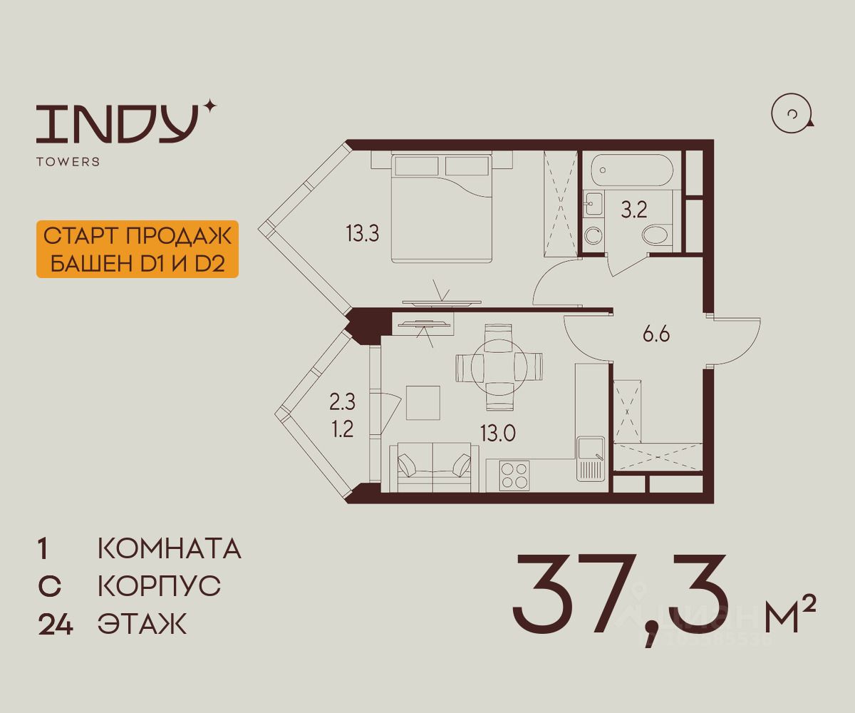 Продажа от застройщика. Продается уютная однокомнатная квартира на 24 этаже жилого комплекса Indy Towers. Вид из окон: во двор. Срок сдачи: 4 кв. 2026 г. Квартира с лоджией. Отделка: Квартиры продаются с отделкой WhiteBox. - Вам не придется заниматься черновыми работами. - Возможность реализовать любой дизайн-проект. Расположение: Комплекс расположен в Хорошевском районе Москвы, на улице Куусенина, в окружении почти 150 гектаров парков для прогулок и активного отдыха. Помимо этого, рядом с комплексом есть: - Детская международная академия тенниса - Ледовый спортивный комплекс ЦСКА - Футбольный стадион "ВЭБ-Арена" - Крупнейший в Европе торовый центр "Авиапарк" - Богатый выбор государственных и частных школ - 8 парков, окружающих комплекс Транспортная доступность: - 3 минут до метро Зорге - 2 минуты пешком до парка Березовая роща - 10 минут на машине до ТТК - 8 минут на машине до ТРЦ Авиапарк Внутренняя инфраструктура Indy Towers: - Кафе и продуктовые магазины - Тайский SPA - Фитнес зал - Комьюнити-зона - Детский клуб Аквилон KIDS - Детский сад Преимущества: - Технология энергоэффективности Termo-S, снижающая теплопотерю домов и позволяющую экономить на электроснабжении - Soundstop - технология дополнительной шумоизоляции на 39 дБ в квартирах с WhiteBox и чистовой отделкой - Система умного дома inHome 3.0 позволит контролировать коммунальные расходы, оплачивать счета и пользоваться услугами, не выходя из умного дома