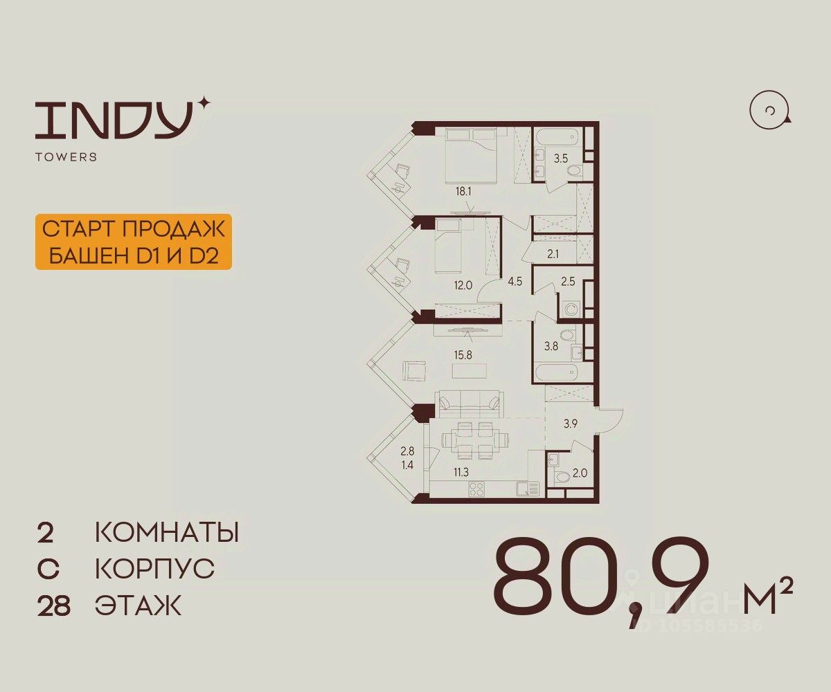 Продается просторная 2-комнатная квартира на 28 этаже жилого комплекса Indy Towers. Вид из окон: во двор. Срок сдачи: 4 кв. 2026 г.