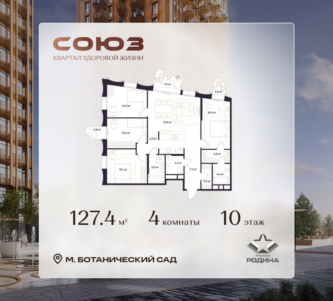 Продаётся 4-комнатная квартира площадью 127.4 м² на 10 этаже в Жилом Комплексе "Союз".