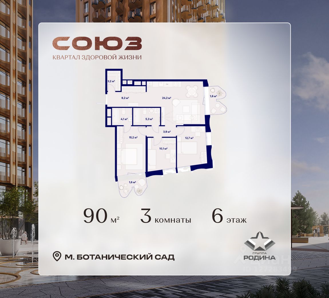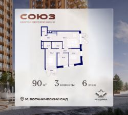 Продаётся 3-комнатная квартира площадью 90 м² на 6 этаже в Жилом Комплексе "Союз".