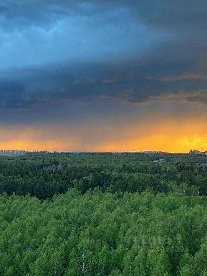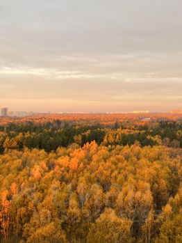 Квартира расположена на 16 этаже, благодаря чему открывается панорамный обзор на бескрайний лес, окна квартиры смотрят на юго-запад, что позволяет наслаждаться красивыми закатами.