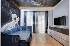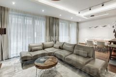 Пространство оформлено в современном стиле с применением натуральных материалов, квартира меблирована и оснащена качественной бытовой техникой.