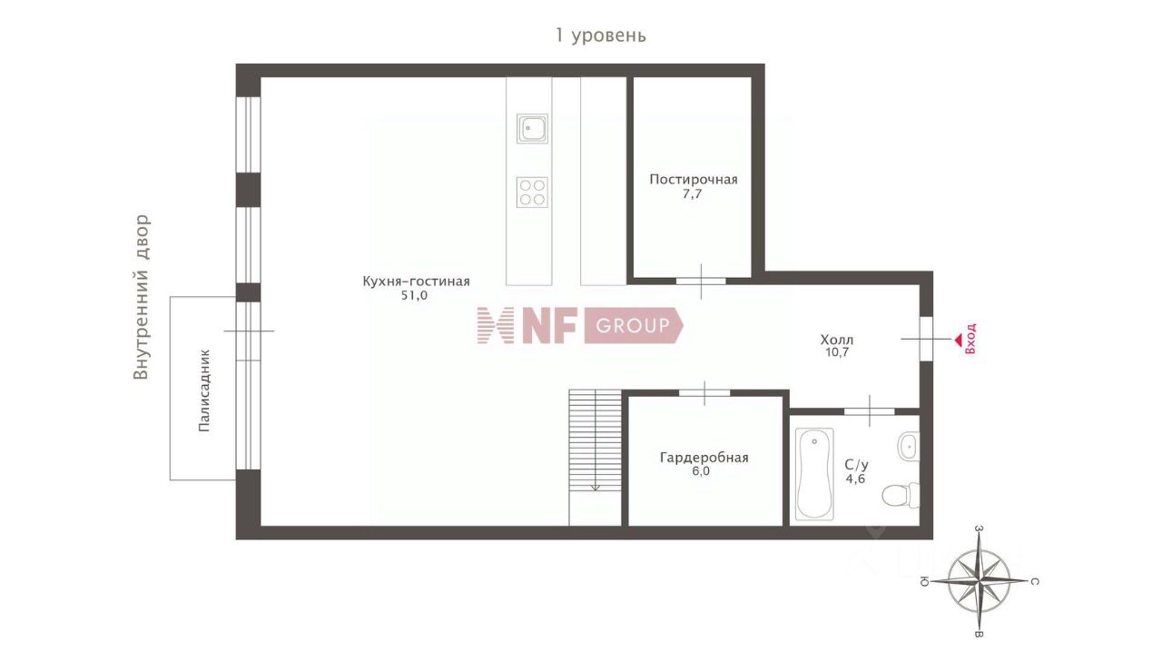 1 уровень: гостиная с зоной кухни и выходом в палисадник, гостевой санузел, гардеробная, постирочная.