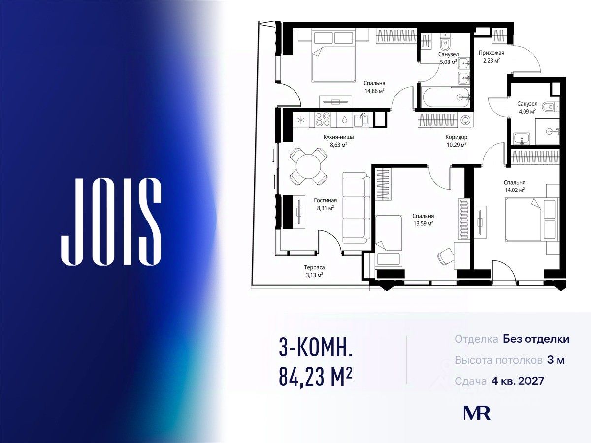 В продаже квартира площадью 84.23 м² без отделки на 19 этаже 55 этажного дома. Квартира расположена в корпусе Anna.