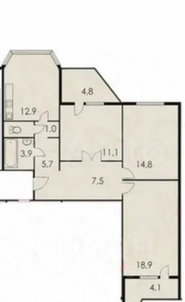 Общая площадь квартиры 76 кв. м, кухня 14 кв. м, две лоджии по 5 и 4 кв. м, комнаты 19, 15 и 11 кв. м.
