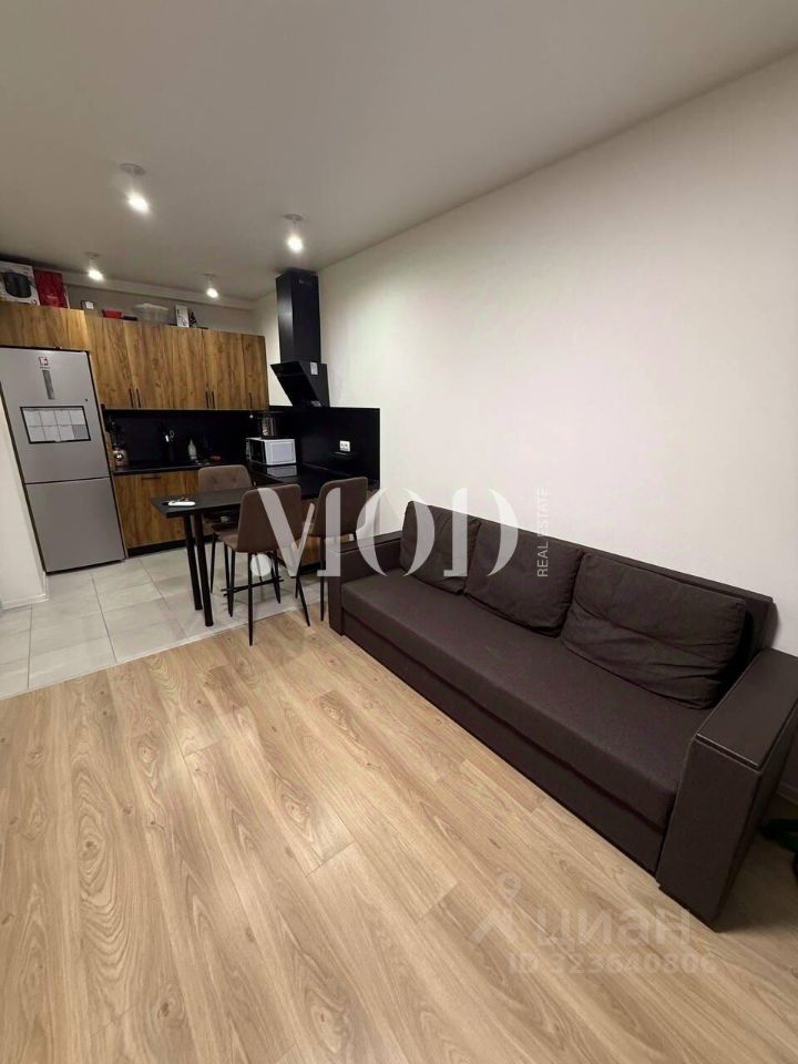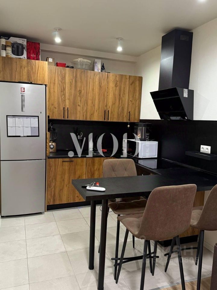 В зоне кухни-гостиной - встроенная мебель со встроенной бытовой техникой, включающей посудомоечную машину, вытяжку, холодильник, которые остаются новому владельцу этой квартиры.