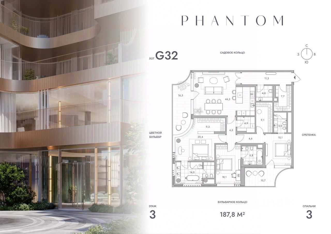 Представляем просторную 3-комнатную квартиру на 3 этаже Резиденций PHANTOM. Общая площадь лота составляет 187,8 кв.м.