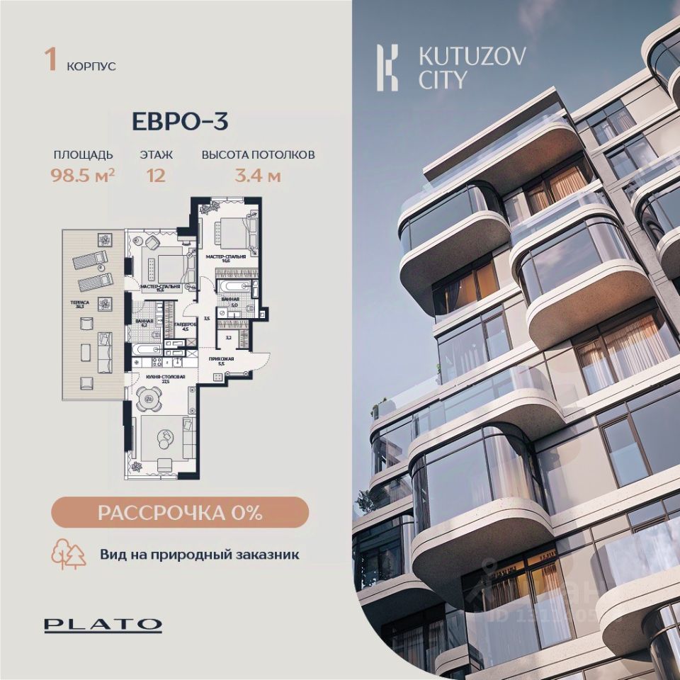 Продается просторная квартира площадью 98,5 м² в башне "Гармония" клубного дома "Кутузов Сити".
