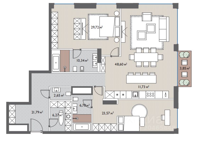 Квартира с готовой дизайнерской отделкой, кухней с островом и встроенной техникой. Отделка премиум-класса: Valcucine, Siematic, V-Zug, Gessi, Antoniolupi, iGuzzini.