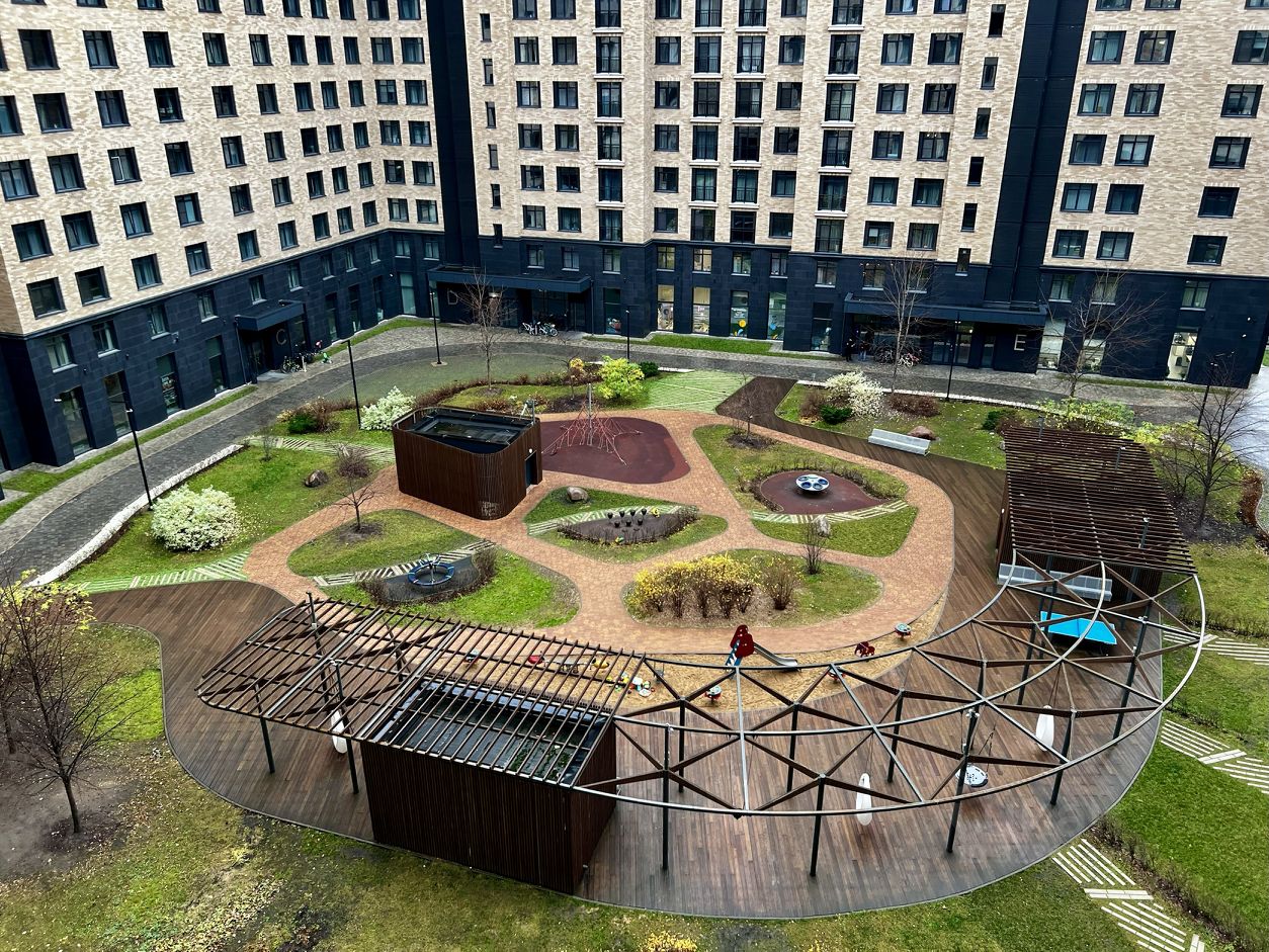Огороженная, охраняемая территория без машин с контролем доступа. Во дворе выполнен ландшафтный дизайн в японском стиле, оборудованы детские площадки и прогулочные зоны. Вокруг жилого комплекса — большая парковка с въездом под шлагбаум только для собственников.