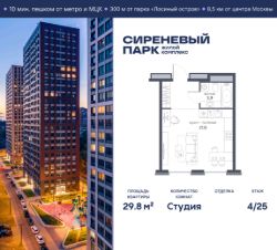 Продаётся просторная студия общей площадью 29.8 м² на 4 этаже в новом жилом комплексе "Сиреневый парк", расположенном в Восточном административном округе Москвы на улице Тагильская. Всего 10 минут ходьбы от станции метро "Бульвар Рокоссовского" и одноимённой платформы МЦК.