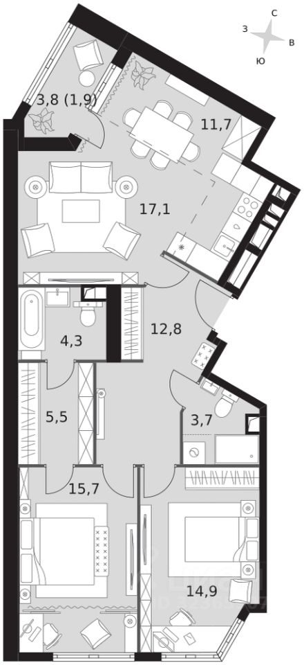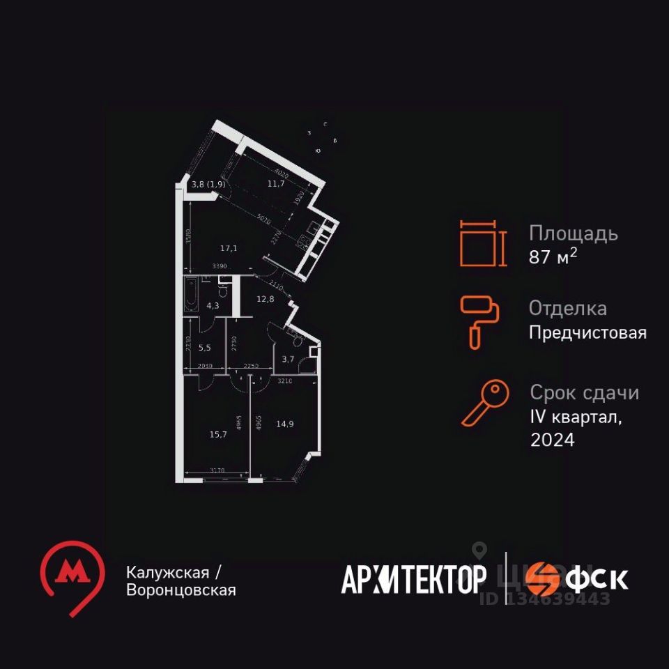 Продаётся 3-к квартира номер 225 общей площадью 87.6 кв.м. на 3-м этаже 46 этажного здания. Отделка Whitebox. Цена с учётом скидки.