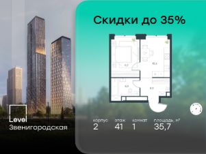 В жилом квартале продаётся 1-комнатная квартира площадью 35.70 кв.м без отделки. Квартира расположена на 41 этаже 64 этажного корпуса 2 в жилом комплексе комфорт класса Level Звенигородская (компания Level Group/Левел групп).