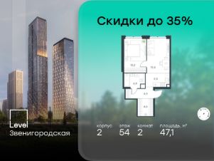 В жилом квартале продаётся 2-комнатная квартира площадью 47.10 кв.м без отделки. Квартира расположена на 54 этаже 64 этажного корпуса 2 в жилом комплексе комфорт класса Level Звенигородская (компания Level Group/Левел групп).