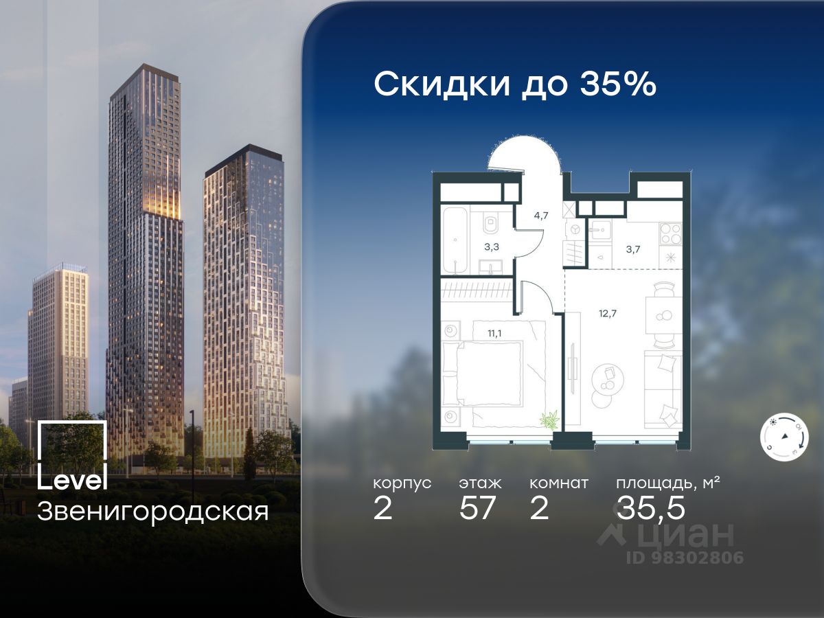 В жилом квартале продаётся 2-комнатная квартира площадью 35.50 кв.м без отделки. Квартира расположена на 57 этаже 64 этажного корпуса 2 в жилом комплексе комфорт класса Level Звенигородская (компания Level Group/Левел групп).