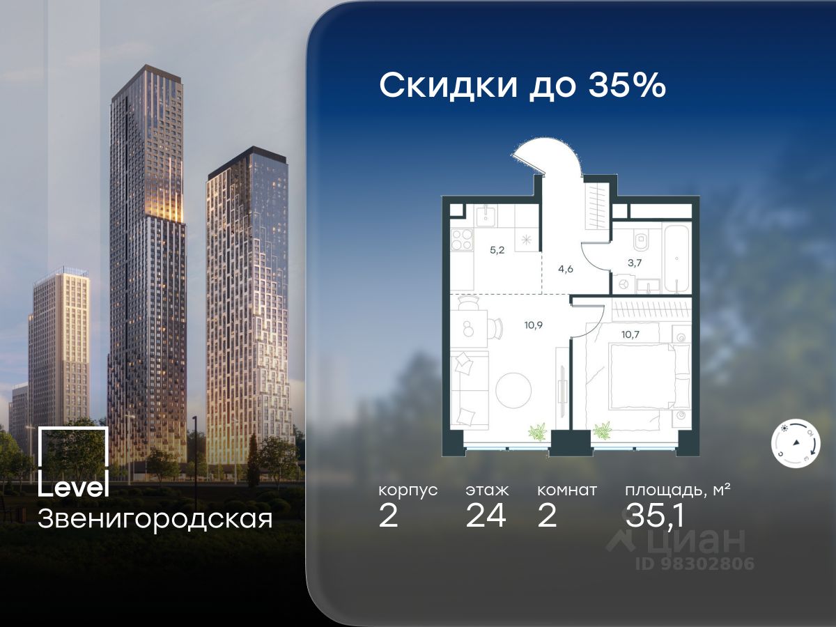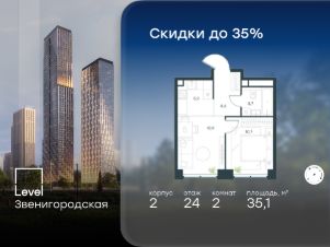 В жилом квартале продаётся 2-комнатная квартира площадью 35.10 кв.м без отделки. Квартира расположена на 24 этаже 64 этажного корпуса 2 в жилом комплексе комфорт класса Level Звенигородская (компания Level Group/Левел групп).