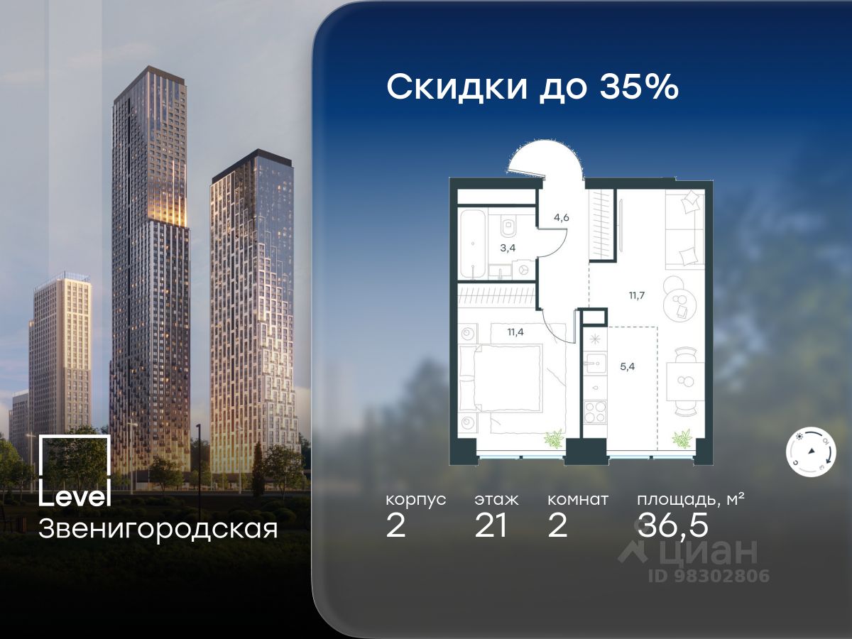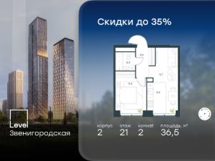 В жилом квартале продаётся 2-комнатная квартира площадью 36.50 кв.м без отделки. Квартира расположена на 21 этаже 64 этажного корпуса 2 в жилом комплексе комфорт класса Level Звенигородская (компания Level Group/Левел групп).