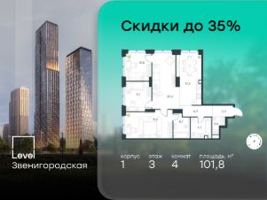 В жилом квартале продаётся 4-комнатная квартира площадью 101.80 кв.м white box. Квартира расположена на 3 этаже 48 этажного корпуса 1 в жилом комплексе комфорт класса Level Звенигородская (компания Level Group/Левел групп).