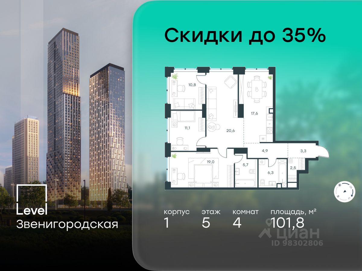 В жилом квартале продаётся 4-комнатная квартира площадью 101.80 кв.м white box. Квартира расположена на 5 этаже 48 этажного корпуса 1 в жилом комплексе комфорт класса Level Звенигородская (компания Level Group/Левел групп).