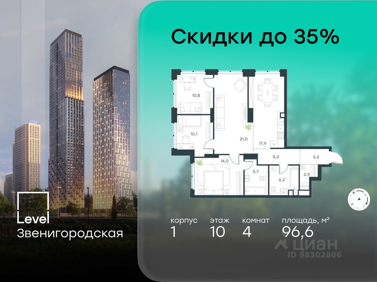 В жилом квартале продаётся 4-комнатная квартира площадью 96.60 кв.м white box. Квартира расположена на 10 этаже 48 этажного корпуса 1 в жилом комплексе комфорт класса Level Звенигородская (компания Level Group/Левел групп).