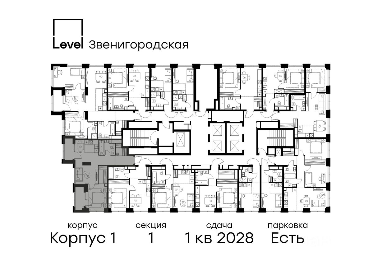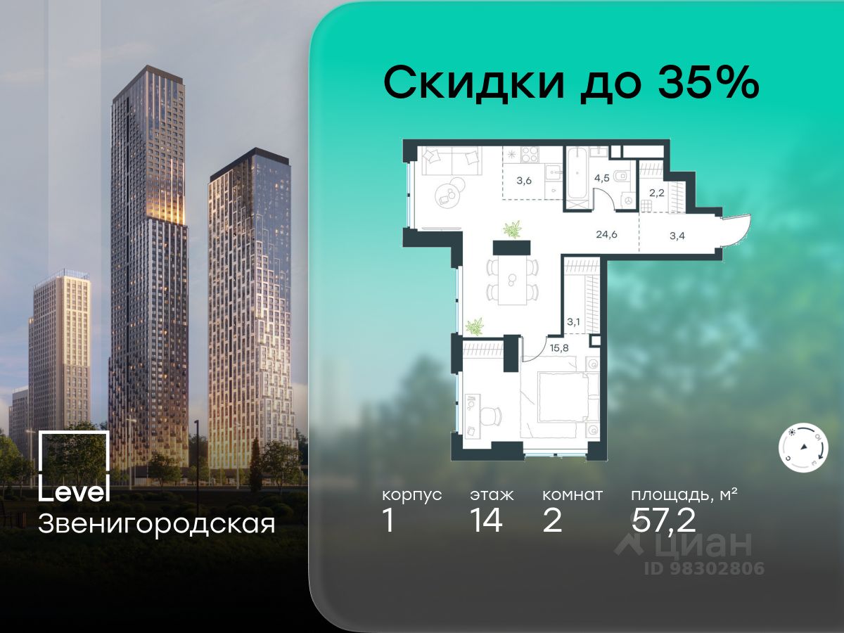 В жилом квартале продаётся 2-комнатная квартира площадью 57.20 кв.м white box. Квартира расположена на 14 этаже 48 этажного корпуса 1 в жилом комплексе комфорт класса Level Звенигородская (компания Level Group/Левел групп).