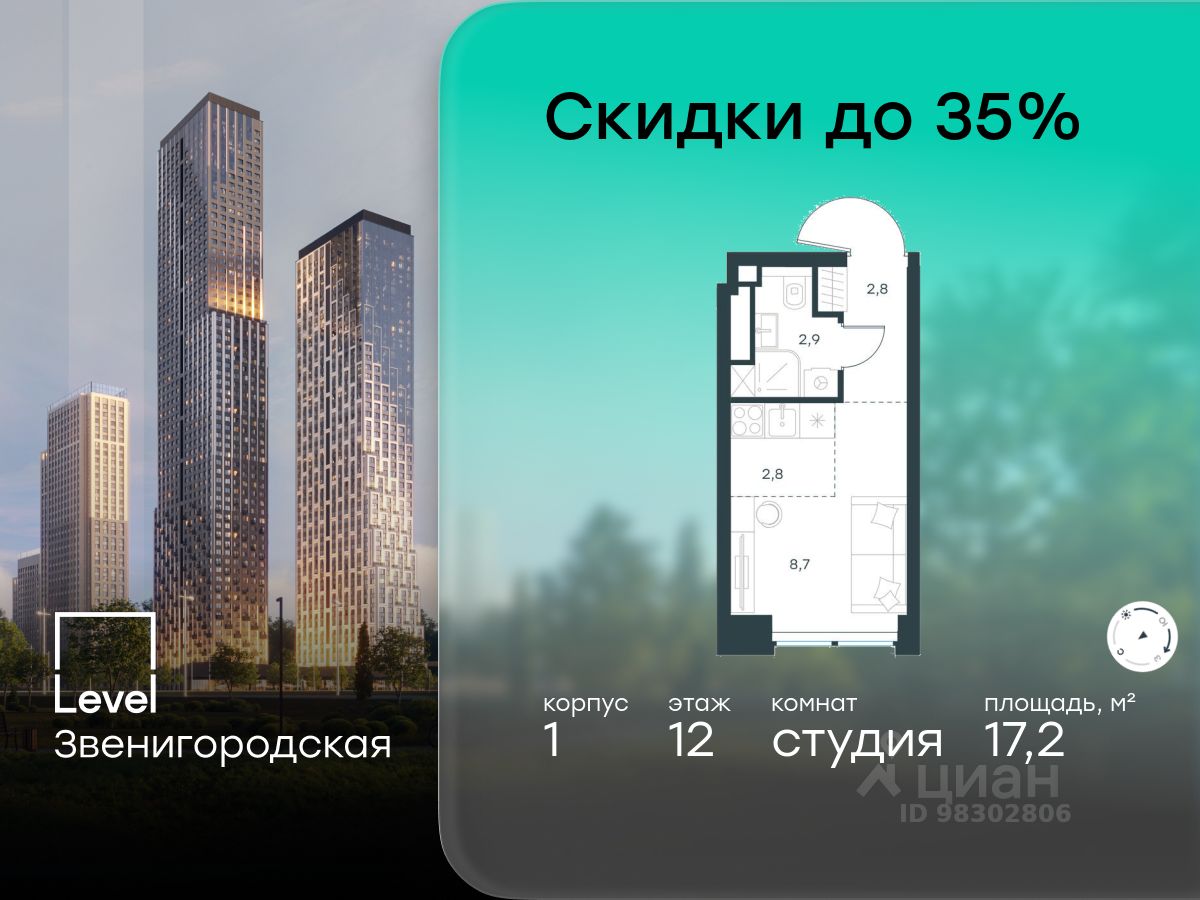 Цена указана с учётом скидки при 100%-й оплате, несубсидированной ипотеке, рассрочке (кроме программы "Рассрочка 0%"). В жилом квартале продаётся студия площадью 17.20 кв.м white box. Квартира расположена на 12 этаже 48 этажного корпуса 1 в жилом комплексе комфорт класса Level Звенигородская (компания Level Group/Левел групп). Отличная транспортная доступность - 5 мин. пешком до метро "Звенигородская" (откроется к окончанию строительства); - 18 мин. пешком до станции МЦК "Хорошёво" и станции БКЛ "Народное ополчение"; - 4 мин. на авто до ТТК; - 8 мин. на авто до Садового кольца; - 15 мин. на авто до Кремля. Продуманный архитектурный проект - Концепция от студии Станислава Михаловского, в основу которой легло единение природы и города; - Двухкамерные стеклопакеты в окнах, алюминиевый и ПВХ профиль - в квартирах тепло зимой и прохладно летом; - С верхних этажей откроются панорамные виды на город, Москву-реку, "Москва-Сити" и Москворецкий парк; - Лобби со всеми удобствами: окна в пол, высокие потолки до 4,7 м, лаунж-зоны, колясочные, гостевые санузлы и мойки для лап животных; - Централизованные водонагреватели гарантируют круглогодичную подачу горячей воды в каждую квартиру. Благоустройство Концепция благоустройства разработана совместно с бюро UNK landscape. Высота башен приближается к 200 метрам - они словно касаются неба. Небесный простор проецируется на территорию двора с помощью подсветки, визуально увеличивая пространство и отражаясь в авторских элементах архитектуры. На территории площадью 0,45 га расположатся: - "Облако событий" - место встреч и общения; - "Облако спорта" - всё для поддержания себя в форме; - "Облако принятия решений" - пространство для работы на свежем воздухе; - "Облако спокойствия" - для отдыха в тишине природы; - "Облако игр" - площадки для подростков и самых маленьких. Инфраструктура В жилом комплексе откроется 21 коммерческое помещение: продуктовые лавки, кафе, салоны красоты, службы доставки и творческие студии. Этап 1 включает строительство двухуровневого подземного паркинга. Всего здесь расположится 351 машино-место, включая семейные места, и 264 кладовых помещения. В распоряжении жителей развитая инфраструктура района: 15 супермаркетов, 5 спортивных объектов, 9 медучреждений, 7 детских садов, 4 школы, 3 благоустроенных парка - всё в шаговой доступности. Инженерия Комфортное перемещение внутри домов будут обеспечивать надёжные лифты с доступом в паркинг с жилых этажей. В каждом корпусе предусмотрено до шести кабин, включая сервисные лифты. Попасть на территорию комплекса можно только по единому ключу доступа. Видеонаблюдение установлено на входах в подъезды, в лобби, в общих зонах, на въезде в паркинг. Гости смогут связаться с жителями дома через входные видеопанели, а управлять доступом на территорию можно через видеодомофон или приложение на телефоне.