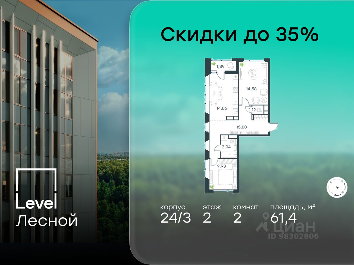 В районе, утопающем в густой зелени лесов, многочисленных парков и скверов, продаётся 2-комнатная квартира площадью 61.40 кв.м с отделкой white box. Квартира расположена на 2 этаже в жилом комплексе комфорт-класса Level Лесной (компания Level Group/Левел групп).