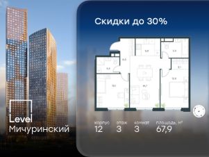 В жилом квартале, расположенном на границе с природным заказником "Долина реки Очаковки", продаётся 3-комнатная квартира площадью 67.90 кв.м без отделки. Квартира расположена на 3 этаже 11-этажного корпуса 12 в жилом комплексе бизнес-класса Level Мичуринский (компания Level Group/Левел групп).