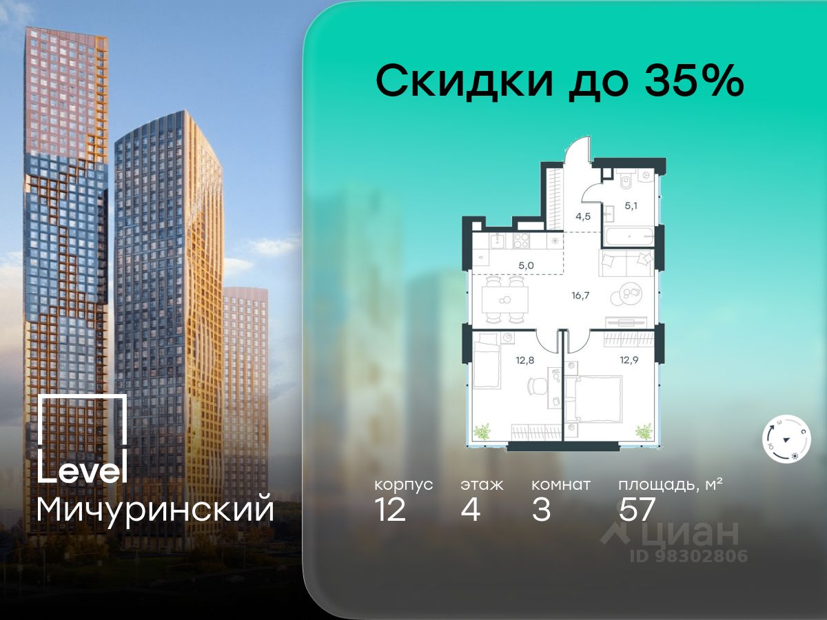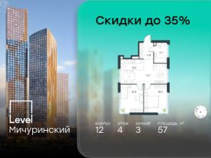 В жилом квартале, расположенном на границе с природным заказником "Долина реки Очаковки", продаётся 3-комнатная квартира площадью 57.00 кв.м без отделки. Квартира расположена на 4 этаже 11-этажного корпуса 12 в жилом комплексе бизнес-класса Level Мичуринский (компания Level Group/Левел групп).