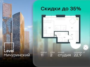 В жилом квартале, расположенном на границе с природным заказником "Долина реки Очаковки", продаётся студия площадью 22.90 кв.м с отделкой white box. Квартира расположена на 2 этаже 24-этажного корпуса 11 в жилом комплексе бизнес-класса Level Мичуринский (компания Level Group/Левел групп).