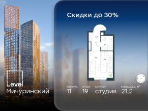 В жилом квартале, расположенном на границе с природным заказником "Долина реки Очаковки", продаётся студия площадью 21.20 кв.м без отделки. Квартира расположена на 19 этаже 24-этажного корпуса 11 в жилом комплексе бизнес-класса Level Мичуринский (компания Level Group/Левел групп).