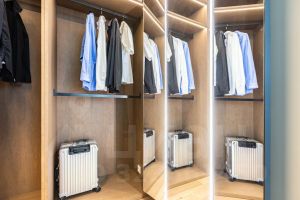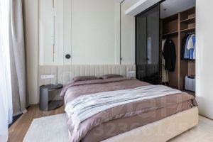 Планировка включает в себя прихожую с гостевым санузлом, просторную кухню-гостиную с обеденной зоной, мастер-спальню и дополнительную изолированную спальню. Системы хранения продуманы до мелочей: в каждой комнате и коридоре предусмотрены встроенные шкафы или гардеробные.