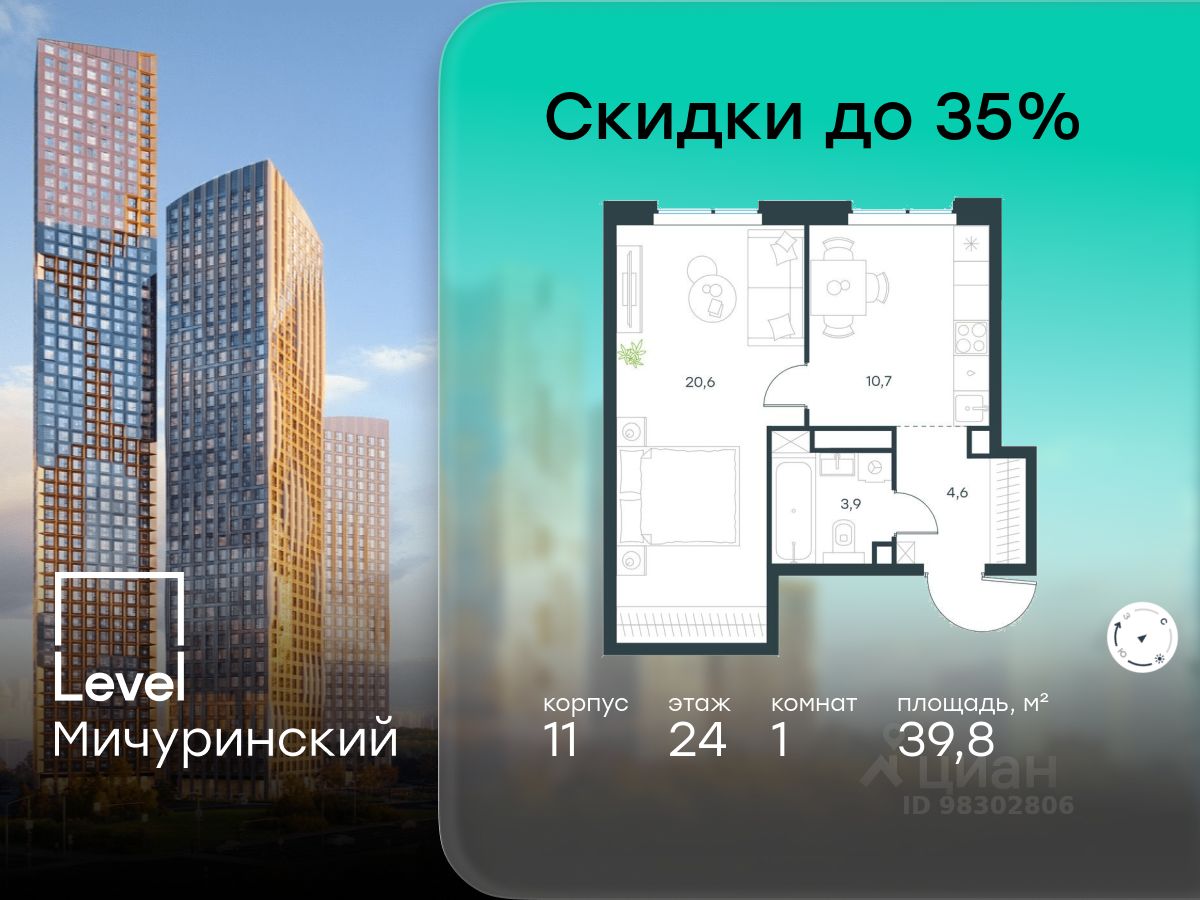 В жилом квартале, расположенном на границе с природным заказником "Долина реки Очаковки", продаётся 1-комнатная квартира площадью 39.80 кв.м без отделки. Квартира расположена на 24 этаже 24-этажного корпуса 11 в жилом комплексе бизнес-класса Level Мичуринский (компания Level Group/Левел групп).