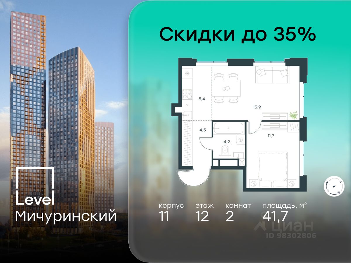 В жилом квартале, расположенном на границе с природным заказником "Долина реки Очаковки", продаётся 2-комнатная квартира площадью 41.70 кв.м без отделки. Квартира расположена на 12 этаже 24-этажного корпуса 11 в жилом комплексе бизнес-класса Level Мичуринский (компания Level Group/Левел групп).