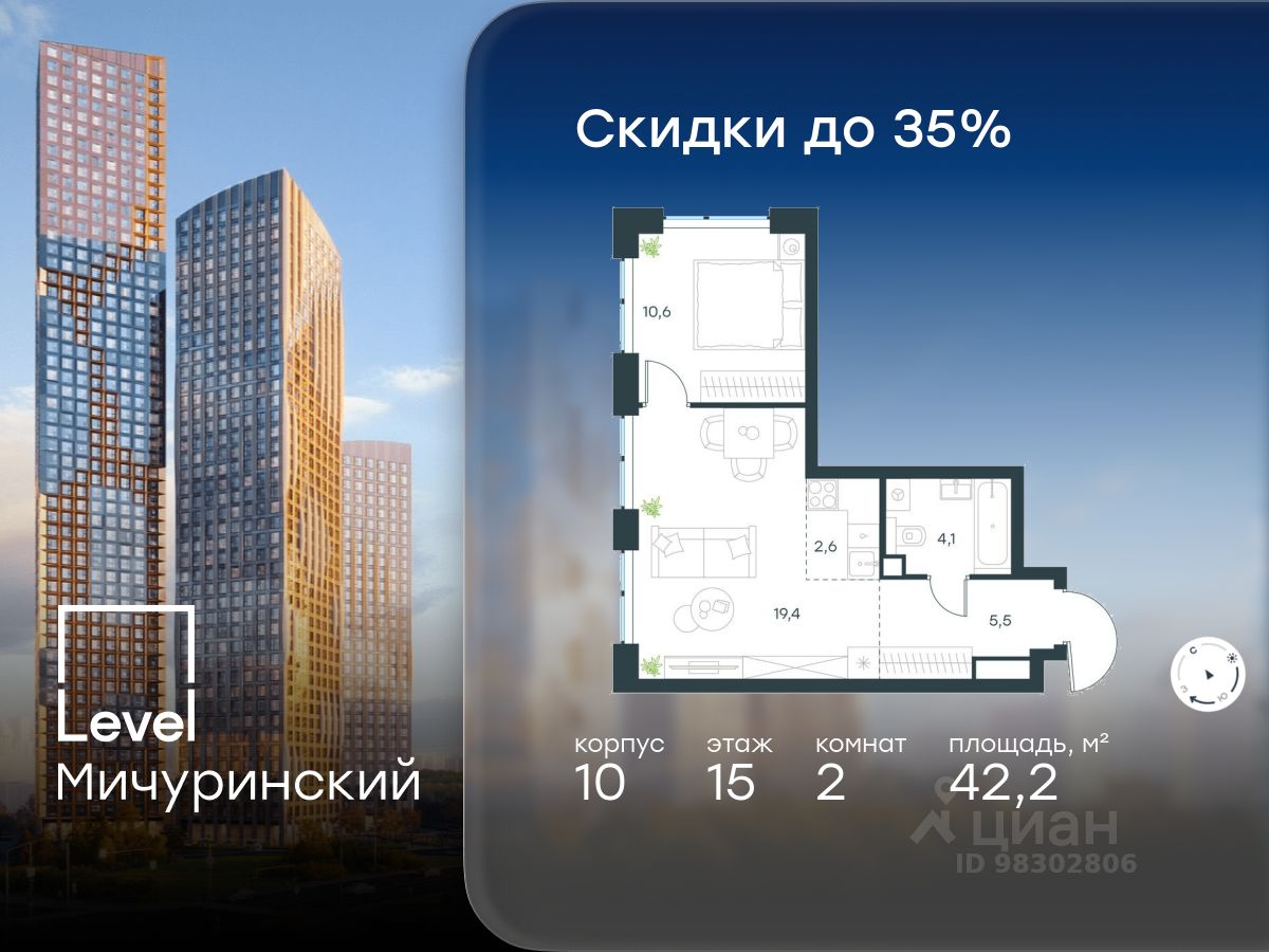 В жилом квартале, расположенном на границе с природным заказником "Долина реки Очаковки", продаётся 2-комнатная квартира площадью 42.20 кв.м с отделкой white box. Квартира расположена на 15 этаже 42-этажного корпуса 10 в жилом комплексе бизнес-класса Level Мичуринский (компания Level Group/Левел групп).