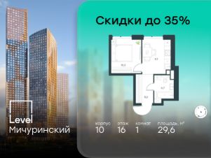 В жилом квартале, расположенном на границе с природным заказником "Долина реки Очаковки", продаётся 1-комнатная квартира площадью 29.60 кв.м с отделкой white box. Квартира расположена на 16 этаже 42-этажного корпуса 10 в жилом комплексе бизнес-класса Level Мичуринский (компания Level Group/Левел групп).