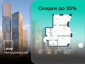 В жилом квартале, расположенном на границе с природным заказником "Долина реки Очаковки", продаётся 3-комнатная квартира площадью 59.70 кв.м с отделкой white box. Квартира расположена на 26 этаже 42-этажного корпуса 10 в жилом комплексе бизнес-класса Level Мичуринский (компания Level Group/Левел групп).