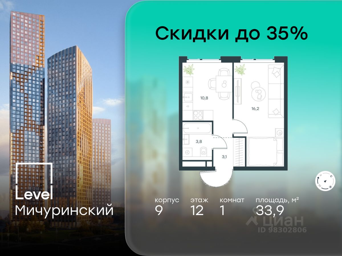 В жилом квартале, расположенном на границе с природным заказником "Долина реки Очаковки", продаётся 1-комнатная квартира площадью 33.90 кв.м без отделки. Квартира расположена на 12 этаже 12-этажного корпуса 9 в жилом комплексе бизнес-класса Level Мичуринский (компания Level Group/Левел групп).