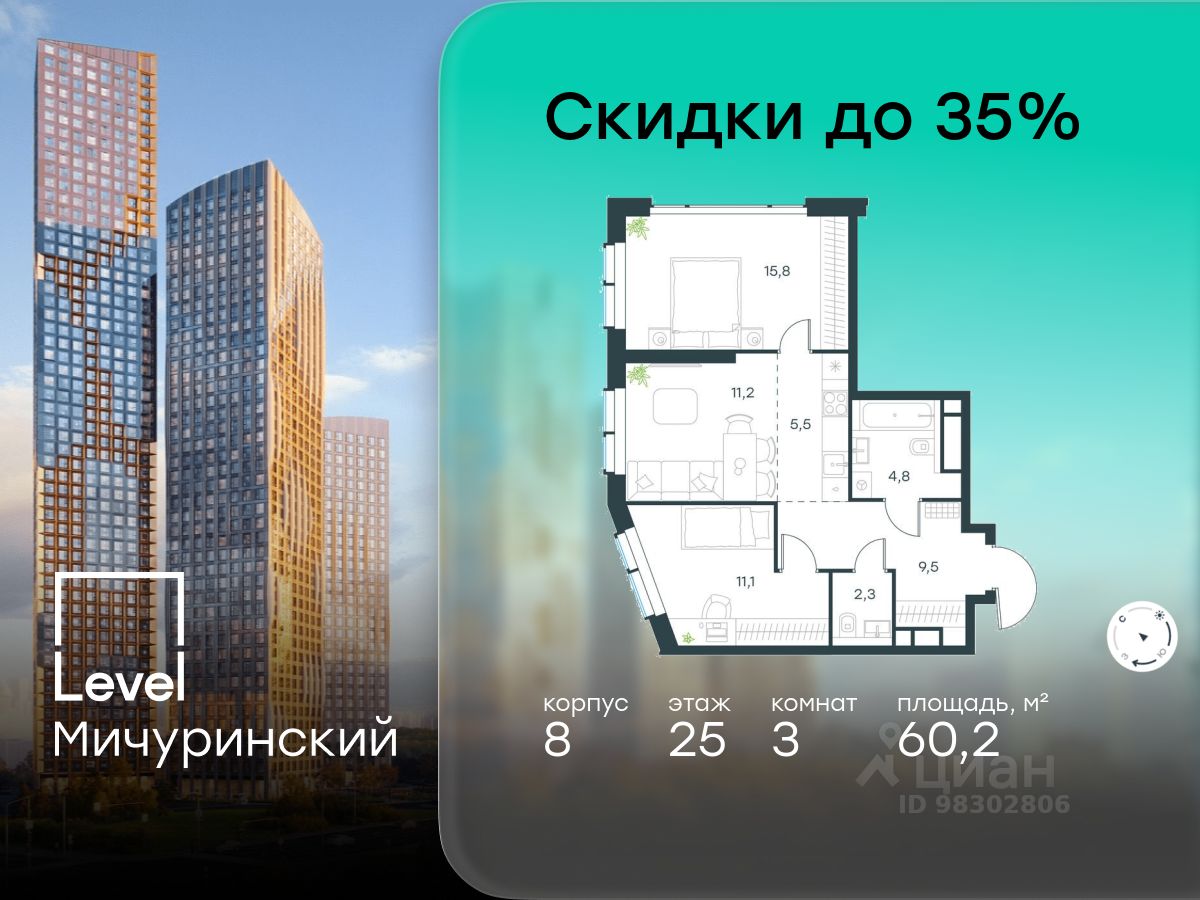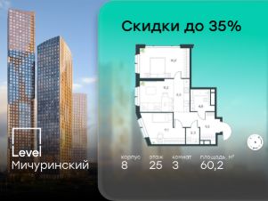 В жилом квартале, расположенном на границе с природным заказником "Долина реки Очаковки", продаётся 3-комнатная квартира площадью 60.20 кв.м без отделки. Квартира расположена на 25 этаже 48-этажного корпуса 8 в жилом комплексе бизнес-класса Level Мичуринский (компания Level Group/Левел групп).