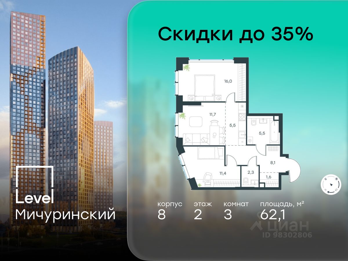 В жилом квартале, расположенном на границе с природным заказником "Долина реки Очаковки", продаётся 3-комнатная квартира площадью 62.10 кв.м без отделки. Квартира расположена на 2 этаже 48-этажного корпуса 8 в жилом комплексе бизнес-класса Level Мичуринский (компания Level Group/Левел групп).