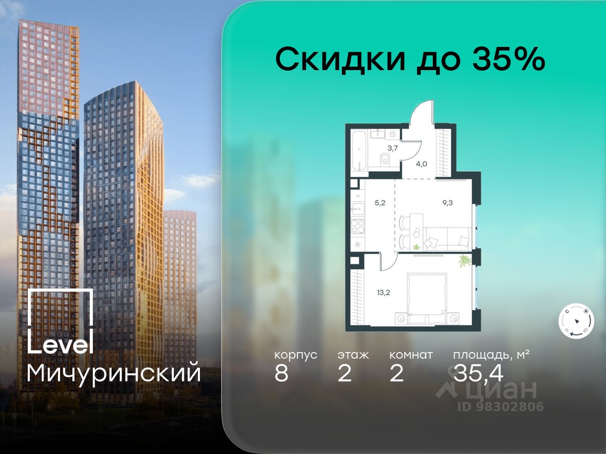 В жилом квартале, расположенном на границе с природным заказником "Долина реки Очаковки", продаётся 2-комнатная квартира площадью 35.40 кв.м без отделки. Квартира расположена на 2 этаже 48-этажного корпуса 8 в жилом комплексе бизнес-класса Level Мичуринский (компания Level Group/Левел групп).