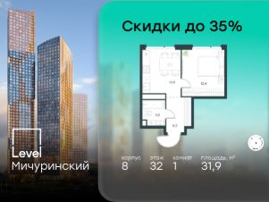 В жилом квартале, расположенном на границе с природным заказником "Долина реки Очаковки", продаётся 1-комнатная квартира площадью 31.90 кв.м без отделки. Квартира расположена на 32 этаже 48-этажного корпуса 8 в жилом комплексе бизнес-класса Level Мичуринский (компания Level Group/Левел групп).