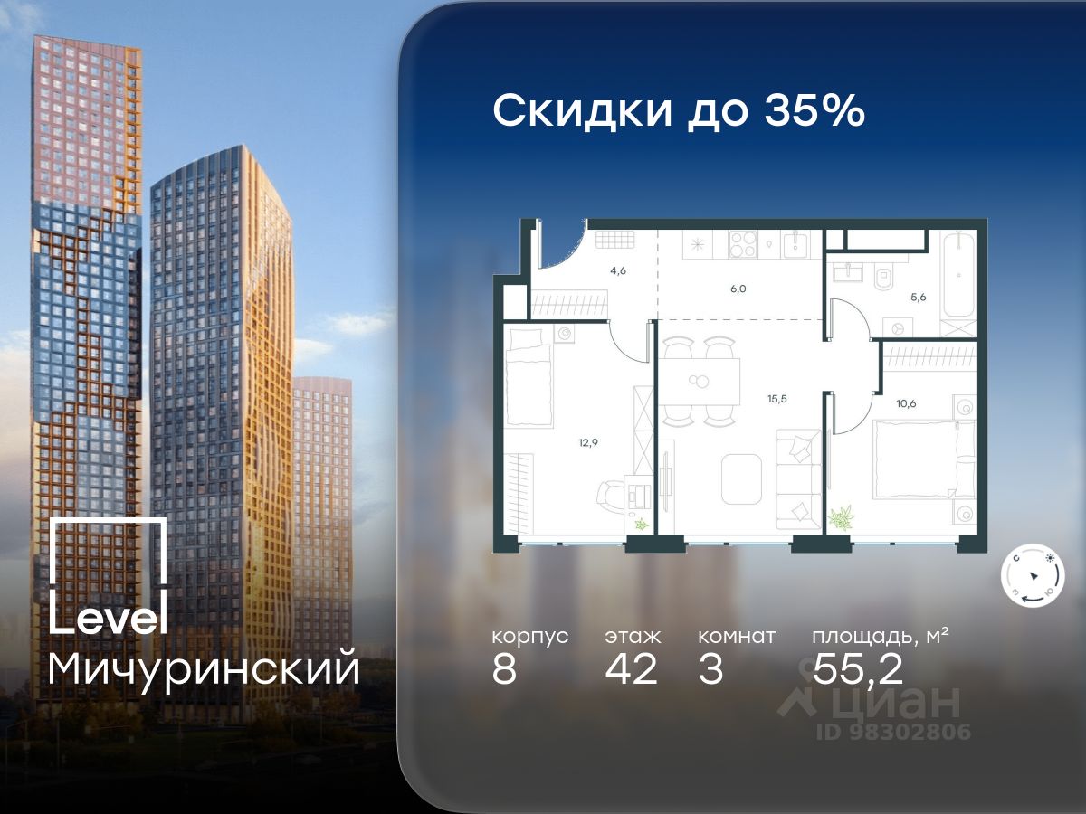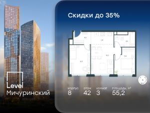 В жилом квартале, расположенном на границе с природным заказником "Долина реки Очаковки", продаётся 3-комнатная квартира площадью 55.20 кв.м без отделки. Квартира расположена на 42 этаже 48-этажного корпуса 8 в жилом комплексе бизнес-класса Level Мичуринский (компания Level Group/Левел групп).