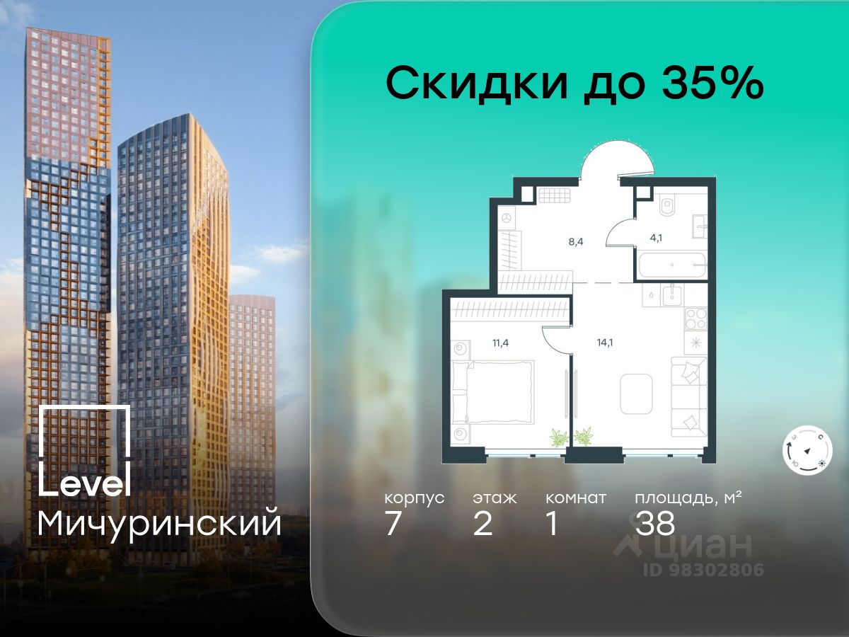 Цена указана с учётом скидки при 100%-й оплате, несубсидированной ипотеке, рассрочке (кроме программы "Рассрочка 0%"). В жилом квартале, расположенном на границе с природным заказником "Долина реки Очаковки", продаётся 1-комнатная квартира площадью 38.00 кв.м без отделки. Квартира расположена на 2 этаже 24-этажного корпуса 7 в жилом комплексе бизнес-класса Level Мичуринский (компания Level Group/Левел групп). Отличная транспортная доступность - 10 мин. пешком до станции метро "Мичуринский проспект" - 15 мин. пешком до станции метро "Аминьевская" - 7 мин. на авто до МКАД - 10 мин. на авто до ТТК - 15 мин. на авто до Москва-Сити Продуманный архитектурный проект - Выразительная архитектура от известных бюро: корпуса 1-6 - СПИЧ, корпуса 7-13 - Borisov Architects; - Из окон открываются живописные виды на парки, Москва-Сити и МГУ; - Высокие потолки до 6,35 м; - Стильные лобби с окнами в пол и высокими потолками до 4,7 м; - С каждого этажа дома на лифте можно спуститься в подземный отапливаемый паркинг. Расположение Level Мичуринский строится в одном из самых зеленых районов Москвы - Очаково-Матвеевское. Этот уголок столицы идеален для поддержания здорового образа жизни. В шаговой доступности от проекта находятся заказник "Долина реки Очаковки" - 1 мин. пешком и Очаковский парк - 7 мин. пешком. На велосипеде можно добраться до таких парков, как "Событие", парк Олимпийской деревни, парк 50-летия Октября и парк Школьников. В 15-минутной доступности на авто расположено более 30 детских садов (из них 14 в пешей доступности), 32 школы (из них 13 в пешей доступности) и 14 вузов. В ближайшем окружении работает более 25 медицинских учреждений, 11 спортивных клубов и 22 продуктовых супермаркета. Внутренняя инфраструктура На территории жилого комплекса строится три детских сада и школа. На первых этажах домов откроется супермаркет, фитнес-центр, ресторан, кафе и другие сервисы. Подземные этажи займут паркинги: трехуровневые в этапах 1 и 2, одноуровневый в этапах 3 и 4. Преимущества проекта - 4,5 га благоустроенной территории с видовым мостом, уличным кинотеатром, зонами для тихого отдыха, работы, воркаута, площадки для петанка, футбола, настольного тенниса и пляжного волейбола; - Дизайнерские лобби с панорамным видом на двор, мойками для лап животных и комфортными зонами ожидания. - Безопасность жителей: круглосуточное видеонаблюдение всех зон общего пользования (лобби, лифты, паркинги, детские площадки), система контроля доступа, управление видеодомофоном через мобильное приложение, единый ключ доступа на территорию жилого комплекса. - Технологии и комфорт: высокоскоростной Wi-Fi в лобби и на придомовой территории, автоматическая система контроля и учета ресурсов, абонентская связь с консьержем, распознавание номеров автомобилей при въезде/выезде в/из паркинга.