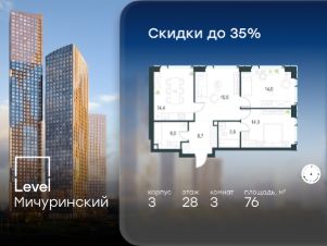 Цена указана с учётом скидки при 100%-й оплате, несубсидированной ипотеке, рассрочке (кроме программы "Рассрочка 0%"). В жилом квартале, расположенном на границе с природным заказником "Долина реки Очаковки", продаётся 3-комнатная квартира площадью 76.00 кв.м с отделкой white box. Квартира расположена на 28 этаже 30-этажного корпуса 3 в жилом комплексе бизнес-класса Level Мичуринский (компания Level Group/Левел групп). Отличная транспортная доступность - 10 мин. пешком до станции метро "Мичуринский проспект" - 15 мин. пешком до станции метро "Аминьевская" - 7 мин. на авто до МКАД - 10 мин. на авто до ТТК - 15 мин. на авто до Москва-Сити Продуманный архитектурный проект - Выразительная архитектура от известных бюро: корпуса 1-6 - СПИЧ, корпуса 7-13 - Borisov Architects; - Из окон открываются живописные виды на парки, Москва-Сити и МГУ; - Высокие потолки до 6,35 м; - Стильные лобби с окнами в пол и высокими потолками до 4,7 м; - С каждого этажа дома на лифте можно спуститься в подземный отапливаемый паркинг. Расположение Level Мичуринский строится в одном из самых зеленых районов Москвы - Очаково-Матвеевское. Этот уголок столицы идеален для поддержания здорового образа жизни. В шаговой доступности от проекта находятся заказник "Долина реки Очаковки" - 1 мин. пешком и Очаковский парк - 7 мин. пешком. На велосипеде можно добраться до таких парков, как "Событие", парк Олимпийской деревни, парк 50-летия Октября и парк Школьников. В 15-минутной доступности на авто расположено более 30 детских садов (из них 14 в пешей доступности), 32 школы (из них 13 в пешей доступности) и 14 вузов. В ближайшем окружении работает более 25 медицинских учреждений, 11 спортивных клубов и 22 продуктовых супермаркета. Внутренняя инфраструктура На территории жилого комплекса строится три детских сада и школа. На первых этажах домов откроется супермаркет, фитнес-центр, ресторан, кафе и другие сервисы. Подземные этажи займут паркинги: трехуровневые в этапах 1 и 2, одноуровневый в этапах 3 и 4. Преимущества проекта - 4,5 га благоустроенной территории с видовым мостом, уличным кинотеатром, зонами для тихого отдыха, работы, воркаута, площадки для петанка, футбола, настольного тенниса и пляжного волейбола; - Дизайнерские лобби с панорамным видом на двор, мойками для лап животных и комфортными зонами ожидания. - Безопасность жителей: круглосуточное видеонаблюдение всех зон общего пользования (лобби, лифты, паркинги, детские площадки), система контроля доступа, управление видеодомофоном через мобильное приложение, единый ключ доступа на территорию жилого комплекса. - Технологии и комфорт: высокоскоростной Wi-Fi в лобби и на придомовой территории, автоматическая система контроля и учета ресурсов, абонентская связь с консьержем, распознавание номеров автомобилей при въезде/выезде в/из паркинга.