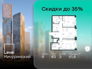 В жилом квартале, расположенном на границе с природным заказником "Долина реки Очаковки", продаётся 3-комнатная квартира площадью 61.40 кв.м без отделки. Квартира расположена на 43 этаже 45-этажного корпуса 4 в жилом комплексе бизнес-класса Level Мичуринский (компания Level Group/Левел групп).