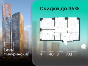 В жилом квартале, расположенном на границе с природным заказником "Долина реки Очаковки", продаётся 3-комнатная квартира площадью 78.10 кв.м без отделки. Квартира расположена на 40 этаже 45-этажного корпуса 4 в жилом комплексе бизнес-класса Level Мичуринский (компания Level Group/Левел групп).