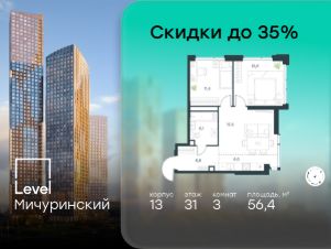 В жилом квартале, расположенном на границе с природным заказником "Долина реки Очаковки", продаётся 3-комнатная квартира площадью 56.40 кв.м без отделки. Квартира расположена на 31 этаже 31-этажного корпуса 13 в жилом комплексе бизнес-класса Level Мичуринский (компания Level Group/Левел групп).